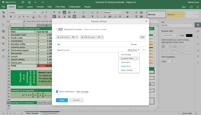 Concrètement, les utilisateurs qui ont la permission Filtre Personnalisé peuvent éditer une feuille de calcul, mais toutes leurs actions sur les filtres seront invisibles aux autres utilisateurs lors de co-édition et ne seront pas enregistrées dans le fichier.