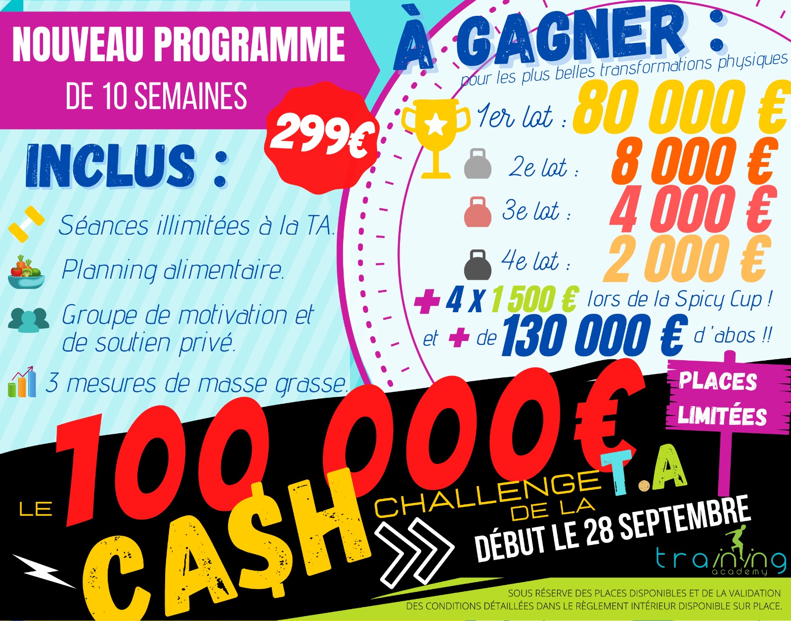 Alors pour fêter sa 12ème rentrée en beauté, la Training Academy lance un événement inédit dans l’histoire du fitness en France : un Challenge extraordinaire de 10 semaines avec 100 000 € cash à gagner pour ceux & celles qui réaliseront les plus belles transformations physiques.