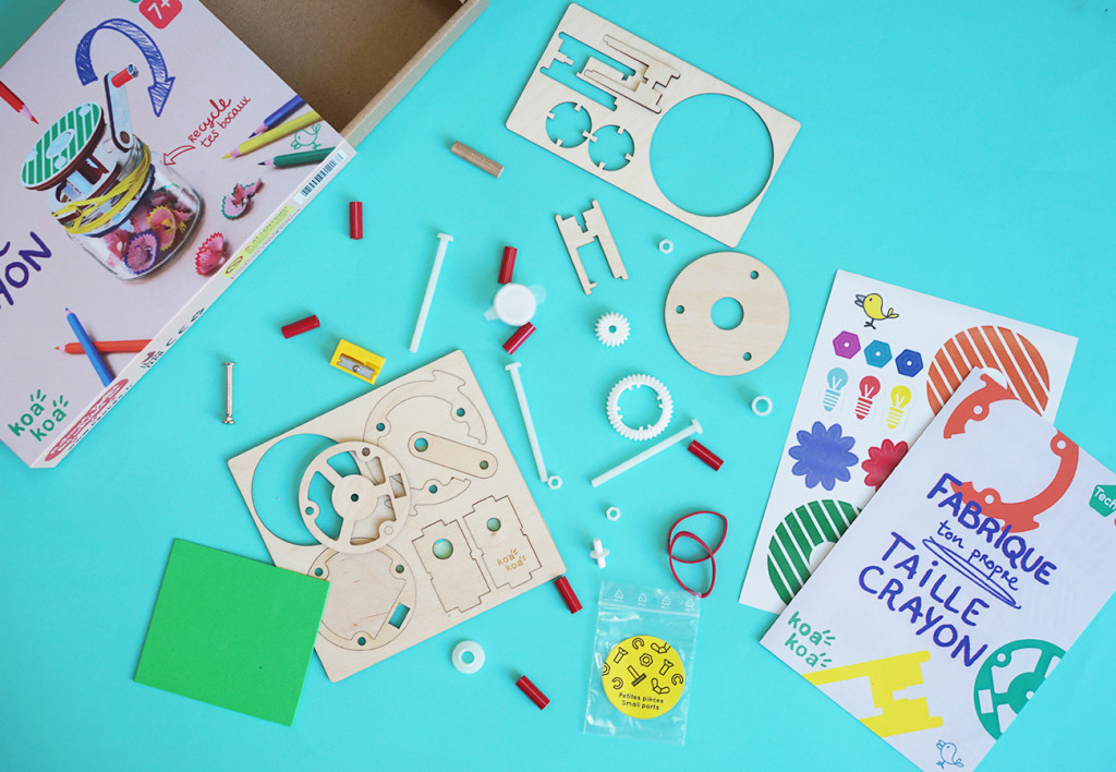 Koa Koa propose enfin aux enfants de fabriquer un taille-crayon en recyclant un bocal vide. Après avoir assemblé le taille-crayon avec les vis, écrous et engrenages à pinion, ils vont découvrir le recyclage. Ils doivent en effet récupérer un bocal vide de confiture par exemple, pour fixer le taille-crayon dessus et en faire un réservoir à épluchures. Ils découvrent ainsi qu’on peut donner une seconde vie aux objets au lieu de les jeter.