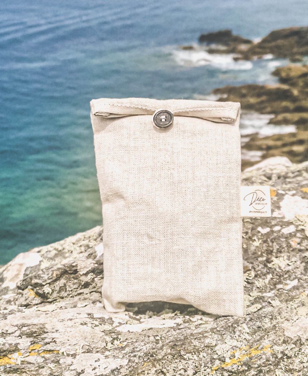 Cette jolie pochette au look sobre permet de transporter des cosmétiques solides sans fuite d’eau. On peut y glisser un savon humide, et quelques heures plus tard, le retrouver tout sec. Linperméable est faite de matériaux recyclés et de tissus peu gourmands en ressources naturelles.