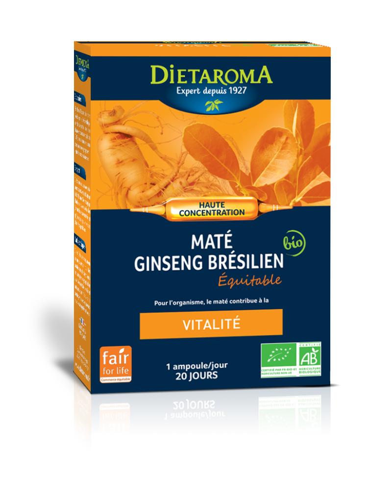Ce CIP allie les propriétés du maté et du ginseng brésilien. Il est conseillé en cas de manque de vitalité, de fatigue, ou de besoin d’un coup de fouet. Ses ingrédients biologiques sont obtenus à partir d’une méthode d’extraction innovante, qui respecte le référentiel Fair for Life.