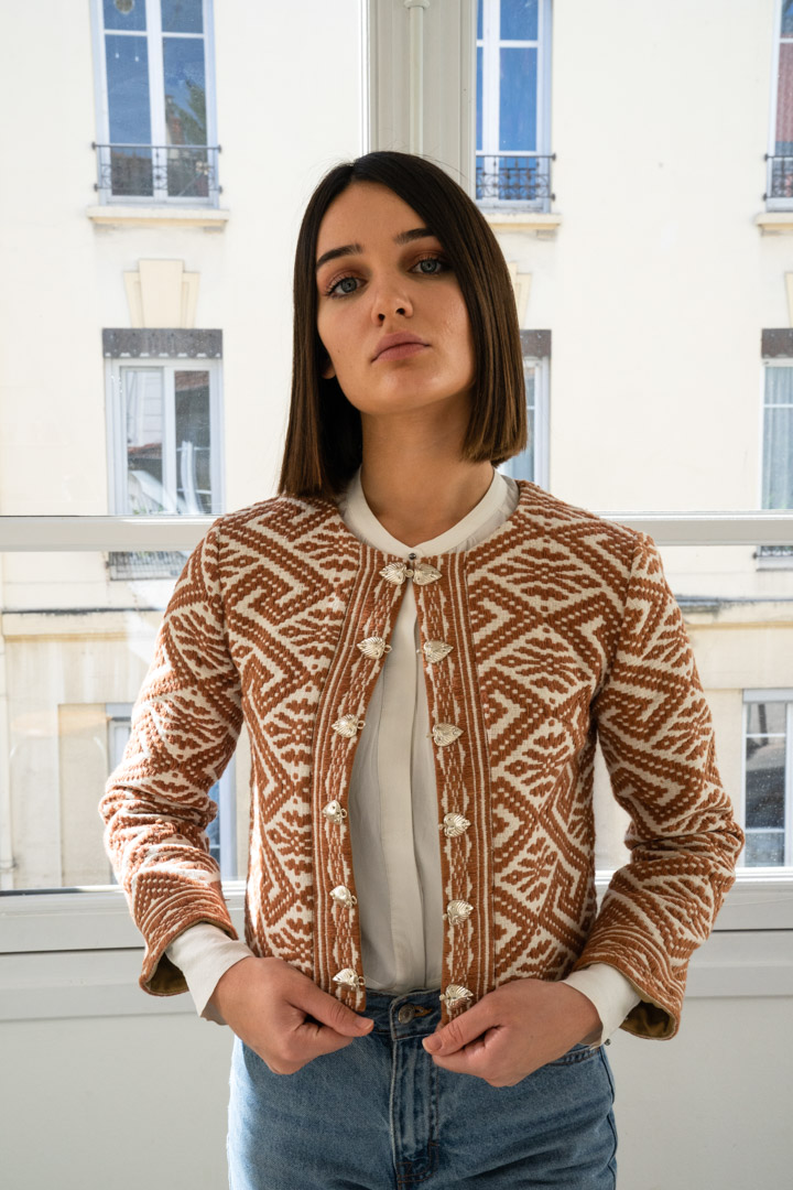 Cette veste connait un tel succès que MUUDANA en est au 4ème réassort ! Son tissu à motif ethnique ne laisse pas indifférent. De même que ses fermoirs originaux confectionnées traditionnellement par l’ethnie Tai Dam. Ajustée à la façon d’un boléro, elle saura pimper un simple à un jean ou une petite robe noire. C’est une pièce d’exception, au tissu unique porteur d’histoire qui traversera les ans sans se démoder. Un beau cadeau à offrir à son amoureuse, sa mère ou sa fille.