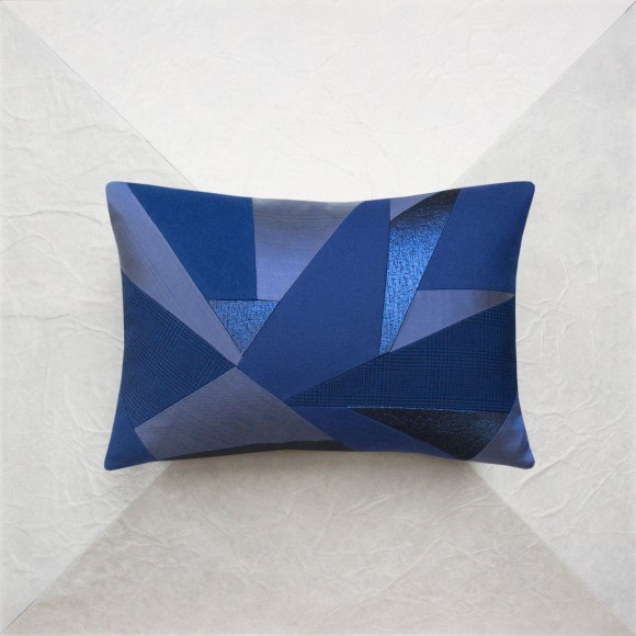 Ce petit coussin spectaculaire est une pièce unique. Ce modèle bleu avec une touche glitter trouvera sa place dans tous les intérieurs. L’utilisation de la soie et de la laine lui confèrent un aspect très chic qui en font une pièce d’exception. Son design moderne, constitué de figures géométriques associant habilement 4 tissus originaux, apporte une dynamique unique à l’ambiance intérieure.
