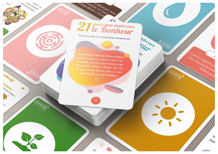 Pour certaines personnes, le bonheur ne va pas de soi… Nous avons donc conçu ce jeu comme un “coup de pouce” qui va leur offrir des outils pratiques et les inviter à les intégrer dans leur quotidien.