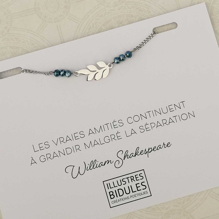 Ce joli bracelet minimaliste avec une breloque en forme de feuille accompagné d’un message poétique de William Shakespeare: “Les vraies amitiés continuent à grandir malgré la séparation”.