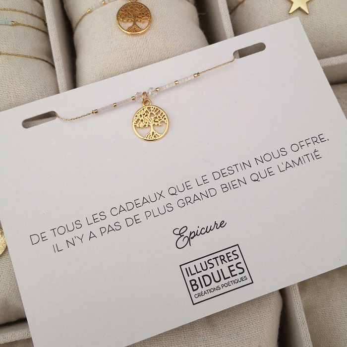 Une belle citation, quelques mots inspirants, qui tous expriment si bien ce qu’on a si souvent du mal à dire. La personne qui reçoit le cadeau est alors doublement ravie, car au-delà de la beauté du bijou, il y a une douce émotion qui réconforte, un petit supplément d’âme qui fait toute la différence.