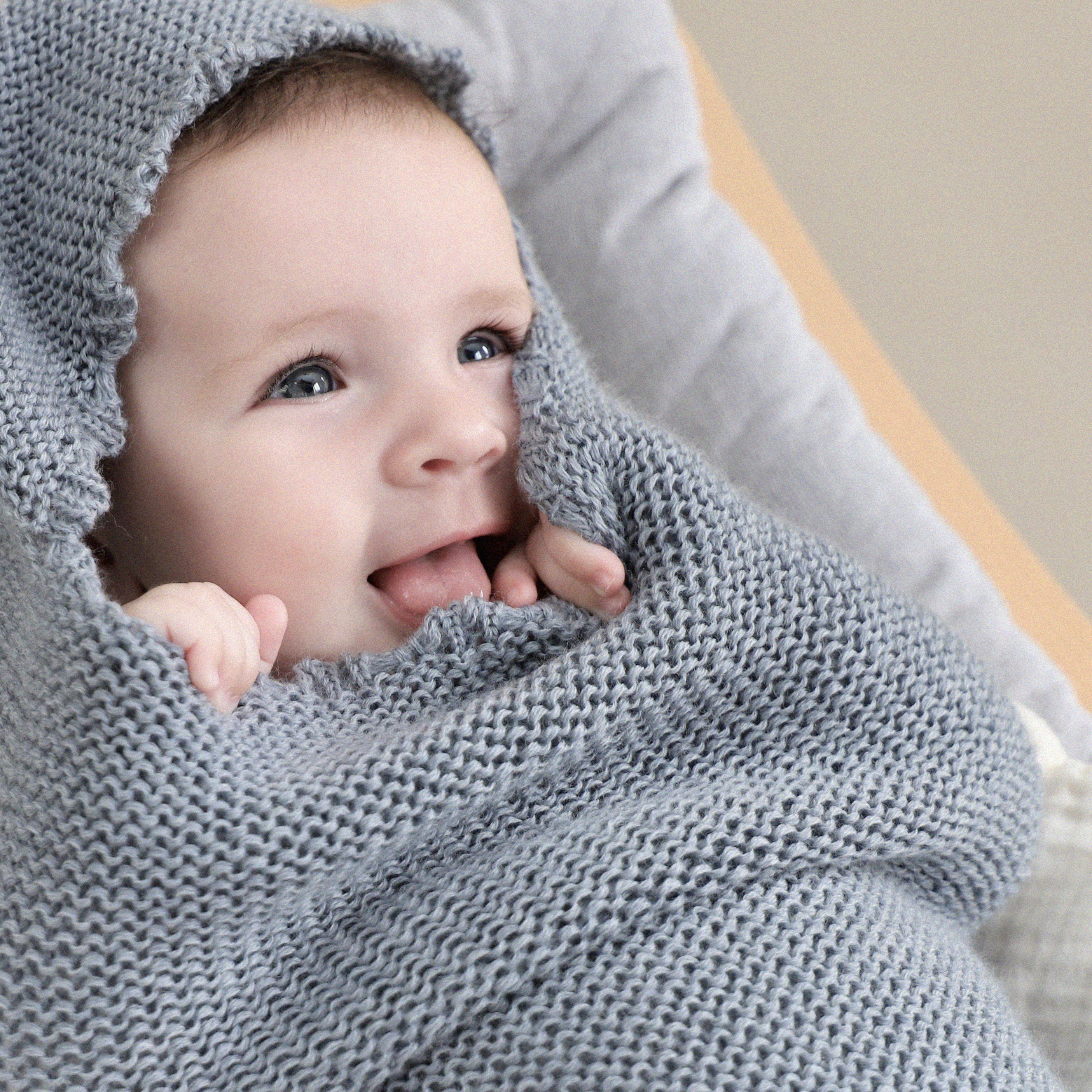 Lavable en machine en programme laine, le Cocon de laine est proposé en taille unique 0-3 mois. Il se décline en trois coloris : gris bleu, terracota et rose poudré.