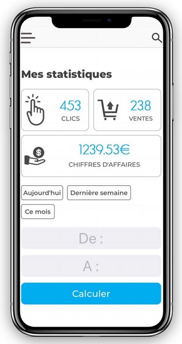 Ensuite, à chaque fois qu’une personne achète le produit via ce lien tracké, il perçoit une commission. Via l’onglet statistiques de l’appli, il peut suivre très simplement les ventes générées et le montant des commissions cumulées.
