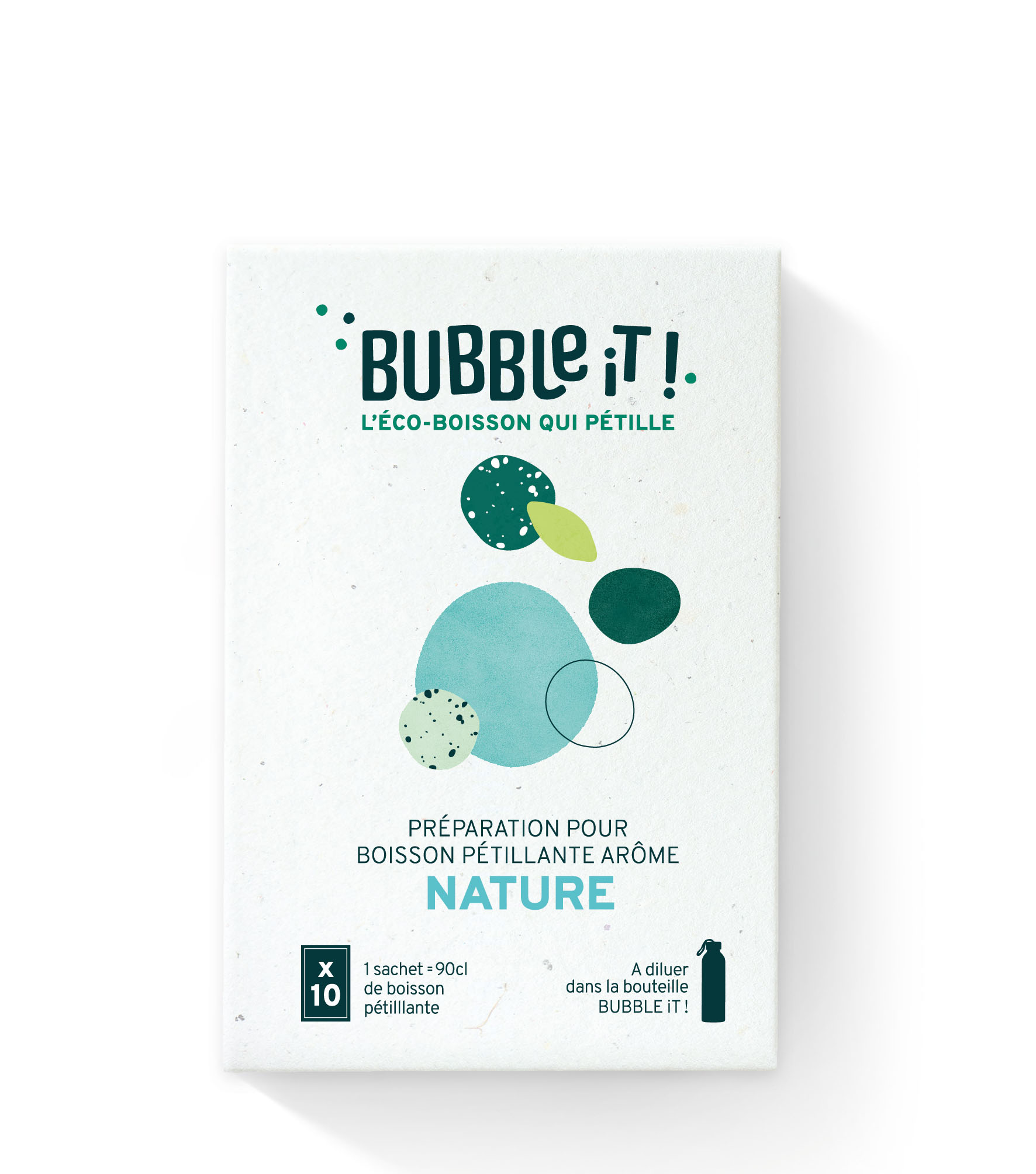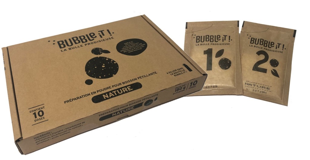 Les sachets BUBBLe iT! Nature permettent d’obtenir une eau pétillante de caractère, aux bulles vives et fines. Avec ce pack de 10 doses, on peut réaliser 10 x 90 cl de boisson pétillante. Prix : 8 euros.