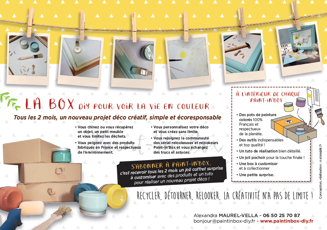 Paint-In’Box est une box créative imaginée par Alexandra Maurel, une passionnée de déco et spécialiste en peintures écoresponsables. Elle fonctionne sur un principe d’abonnement, avec une box tous les deux mois, et est destinée à toutes celles et ceux qui aiment bricoler, récupérer et chiner.