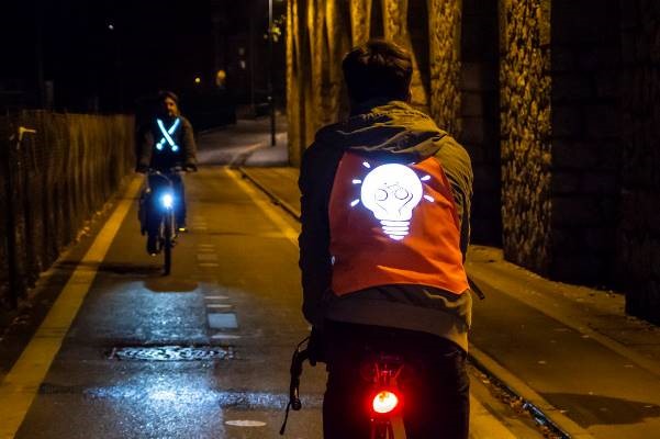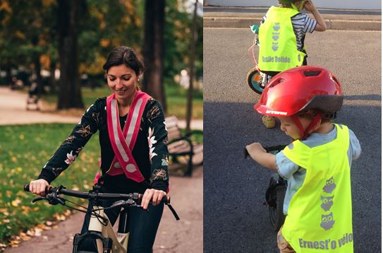 Très vite, elle se prend au jeu et imagine une gamme d’accessoires, de la ceinture à l’écharpe, en passant par le chasuble et le poncho, pour rendre les cyclistes visibles sur la voie publique.