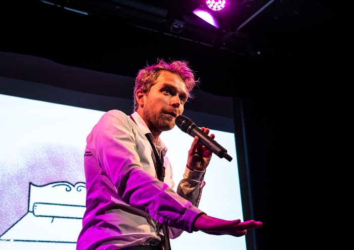 Dès le début de l’épidémie, Eurêka a opté pour une formule de concert seul-en-scène. Afin que les spectateurs en prennent tout de même plein les yeux, chaque morceau s’est vu illustré par un dessin animé projeté sur un écran en fond de scène.