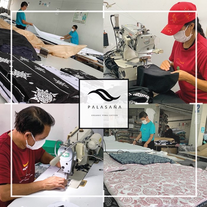 Le coton de Pima sélectionné par Palasaña est certifié « GOTS » (Global Organic Textil Standard). C’est le label de référence pour les vêtements biologiques, c’est également la certification la plus rigoureuse sur la traçabilité et l’exploitation du coton bio. La démarche de Palasaña s’inscrit également dans une chaîne de production certifiée commerce équitable.