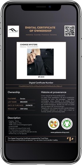 Le certificat est aussi un vecteur pour renforcer l’économie circulaire : si vous désirez offrir ou revendre votre chemise Palasaña, le certificat sera transmis avec, grâce à votre téléphone portable ! Ainsi votre chemise ne perdra pas une miette de sa valeur.