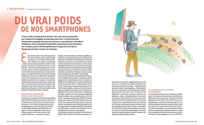 Au fil des pages, les lecteurs.trices vont ainsi pouvoir découvrir les impacts du numérique sur la planète et les cerveaux. Par exemple, combien savent qu’il faut 70 matériaux pour construire le smartphone qui se trouve dans notre poche ? Pourtant, nous sommes 88 % en France à en changer au bout de deux ans, alors qu’il fonctionne encore…