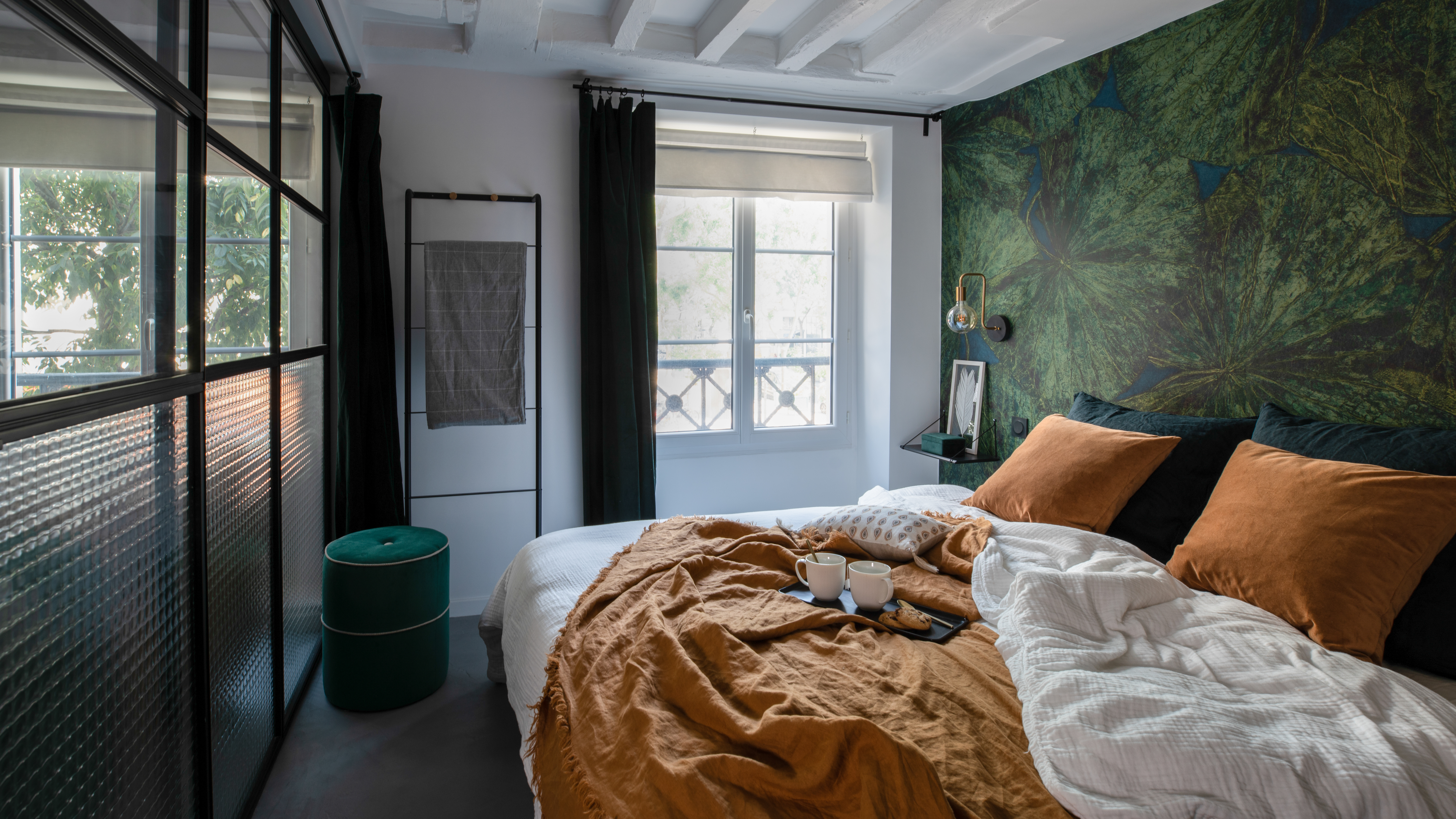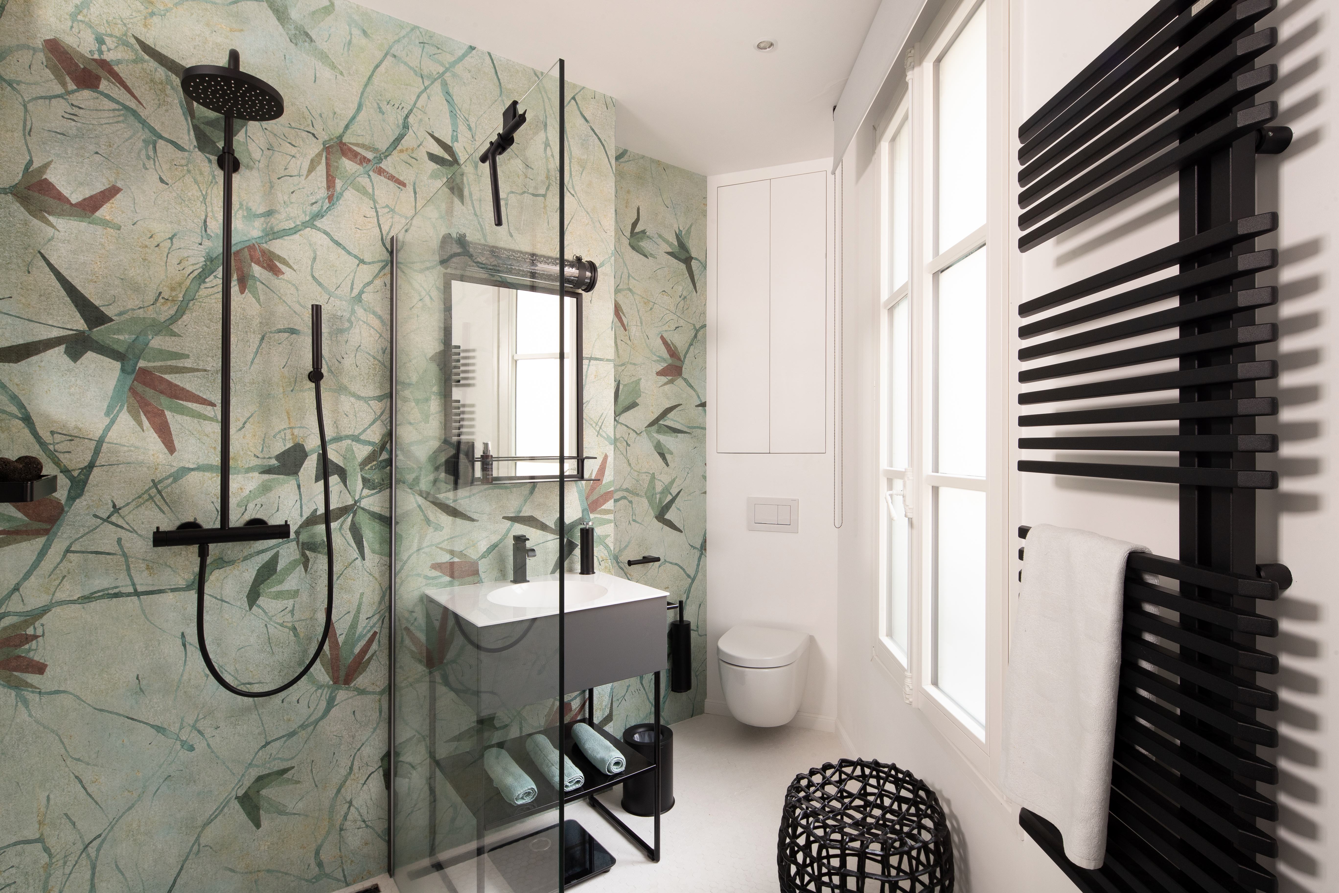 Une salle de bain végétale et graphique dans un appartement familial du 10ème arrondissement, à Paris