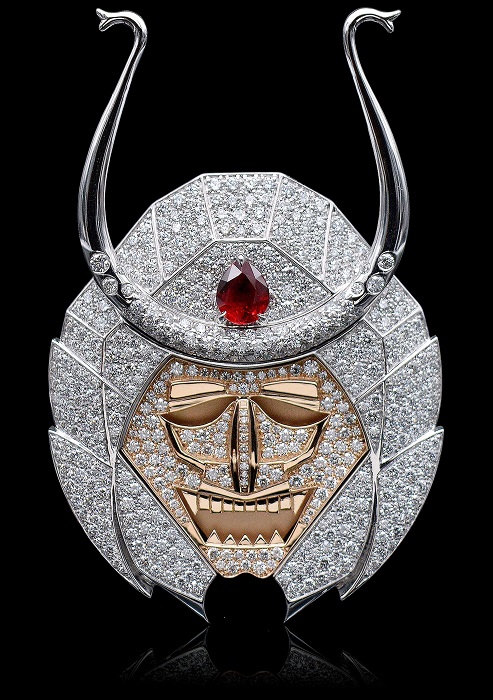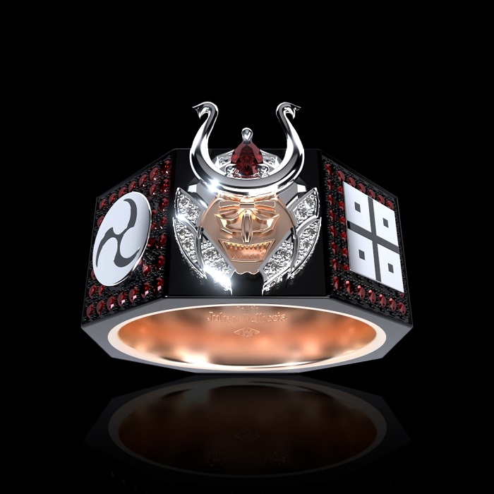Cette magnifique bague est réalisée en or noir, blanc et rose 18 carats. Elle est sertie de 30 diamants, de 54 rubis et d’un rubis poire ornant le casque du Samuraï.