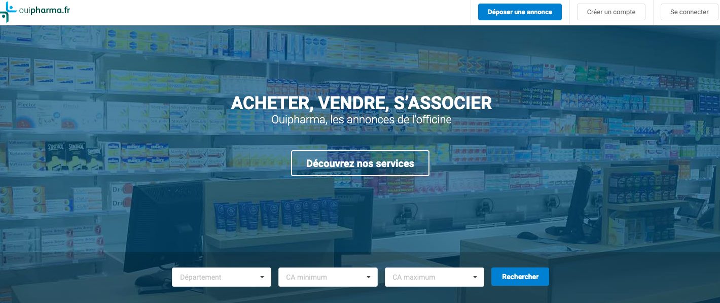 Ouipharma est la première plateforme professionnelle de mise en relation entre vendeurs et acheteurs uniquement dédiée au secteur de la pharmacie. Elle permet de consulter les offres de pharmacies en vente en France, de créer une annonce pour vendre son officine, et de consulter ou créer des offres d’emploi.