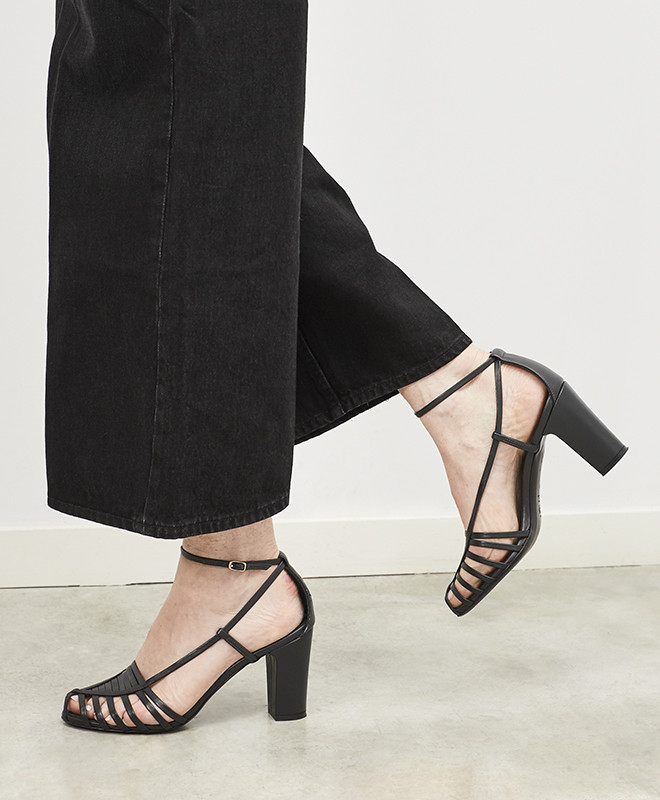 Ces sandales à l’esprit 80’s et aux brides fines se déclinent également en version talon plat et en divers coloris. Cinq mètres de brides sont nécessaires pour les fabriquer, et cinq paires seulement ont été réalisées avec le cuir disponible.