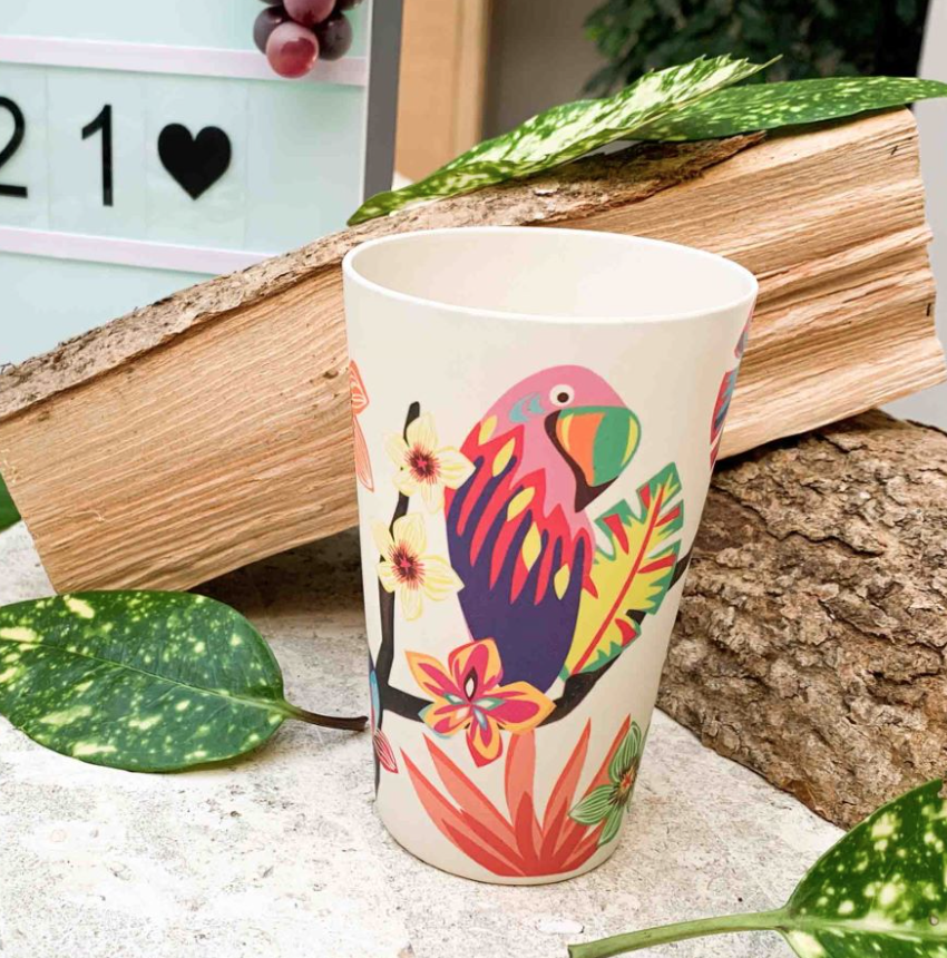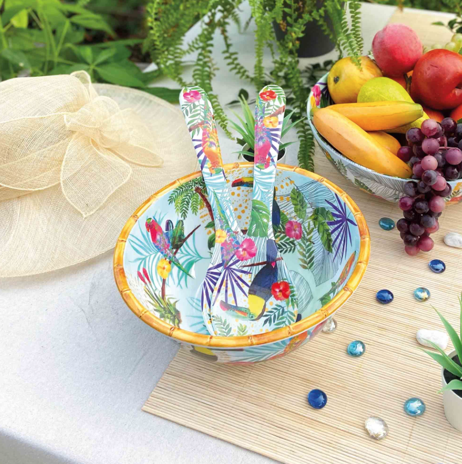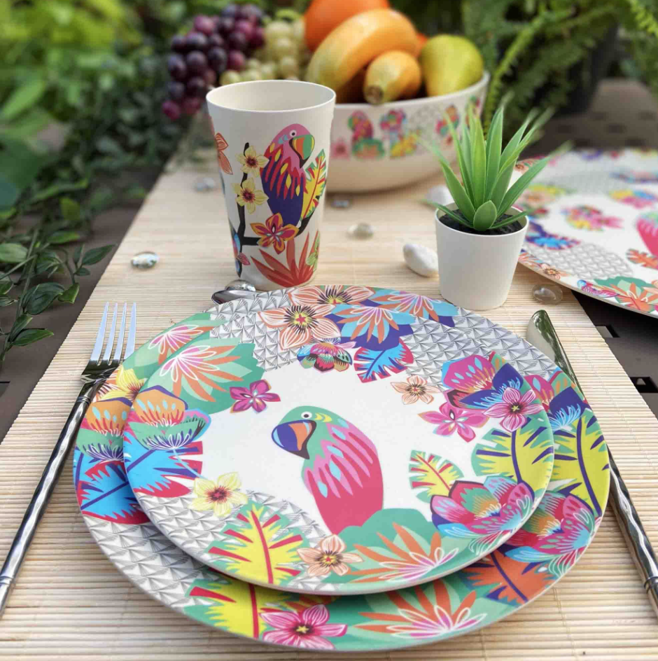 Avec cette vaisselle colorée aux finitions imitation bambou, le soleil et la chaleur des tropiques s’invitent sur toutes les tables. Toucans et perroquets sont représentés dans une végétation luxuriante, imprimés sur un dégradé de bleu, blanc et vert.