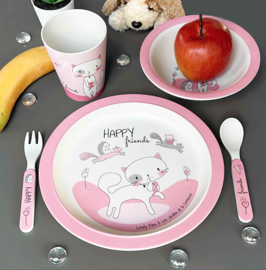 Les coffrets repas contiennent une assiette, un bol, un verre et des couverts ergonomiques en fibre de bambou ; ils permettent à bébé d’apprendre à manger correctement en toute sécurité, et font de jolis cadeaux de naissance.