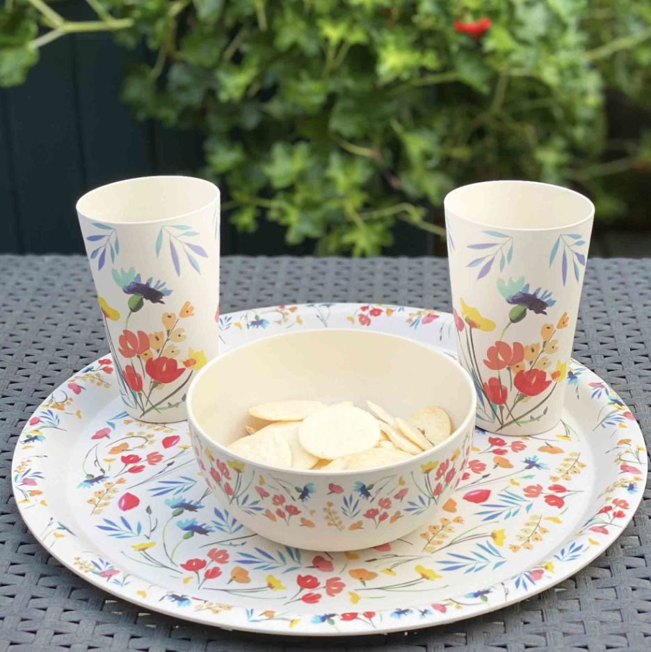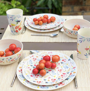 Les services « Perroquets » et « Fleurs des champs » sont composés d’assiettes, saladiers, bols, plats et plateaux de service, verres, mugs isothermes et boites de conservation qui peuvent être utilisés pour des repas en extérieur et en intérieur, ou en camping chic. Les saladiers et plats sont particulièrement pratiques pour un usage quotidien.