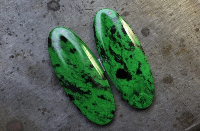 Parce que la joaillerie, c’est aussi les pierres ornementales, Aronine présente cette paire de Maw Sit Sit au vert éclatant.