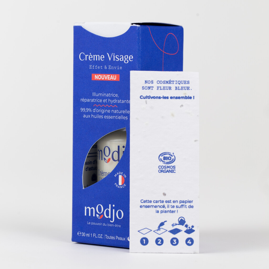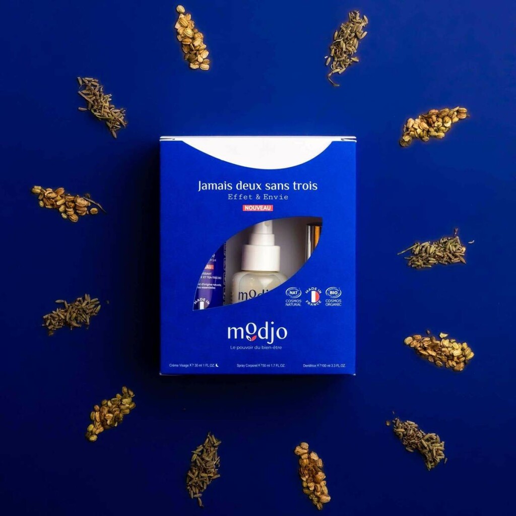 Ce coffret contient les trois produits stars de la gamme Effet & Envie de Modjo : la crème visage, le spray corporel et le dentifrice.