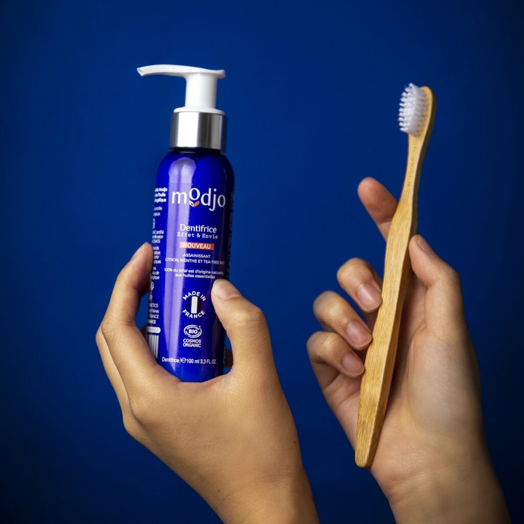 Le dentifrice est le best-seller de Modjo. Testé par un laboratoire indépendant sur un échantillon de fumeurs, il a permis au tiers des participant·es de gagner jusqu’à 3 teintes de blanc en 28 jours. Il nettoie tout en douceur, renforce les gencives et assainit, laissant une agréable sensation de confort et de propreté.
