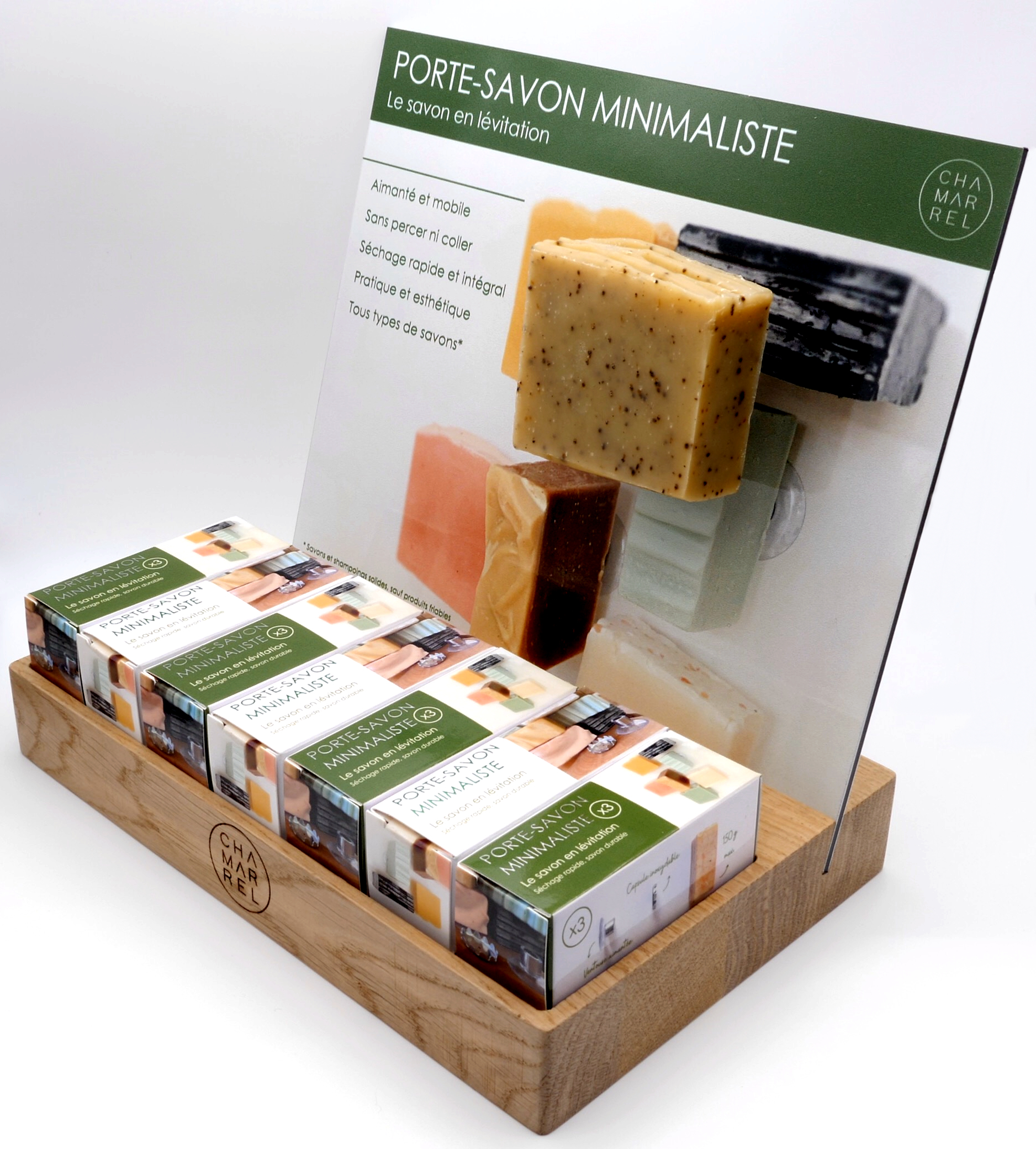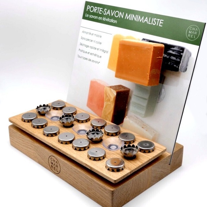 Dès 2019, Chamarrel® a expérimenté plusieurs produits autour du savon solide, notamment le porte-savon avec ventouse.