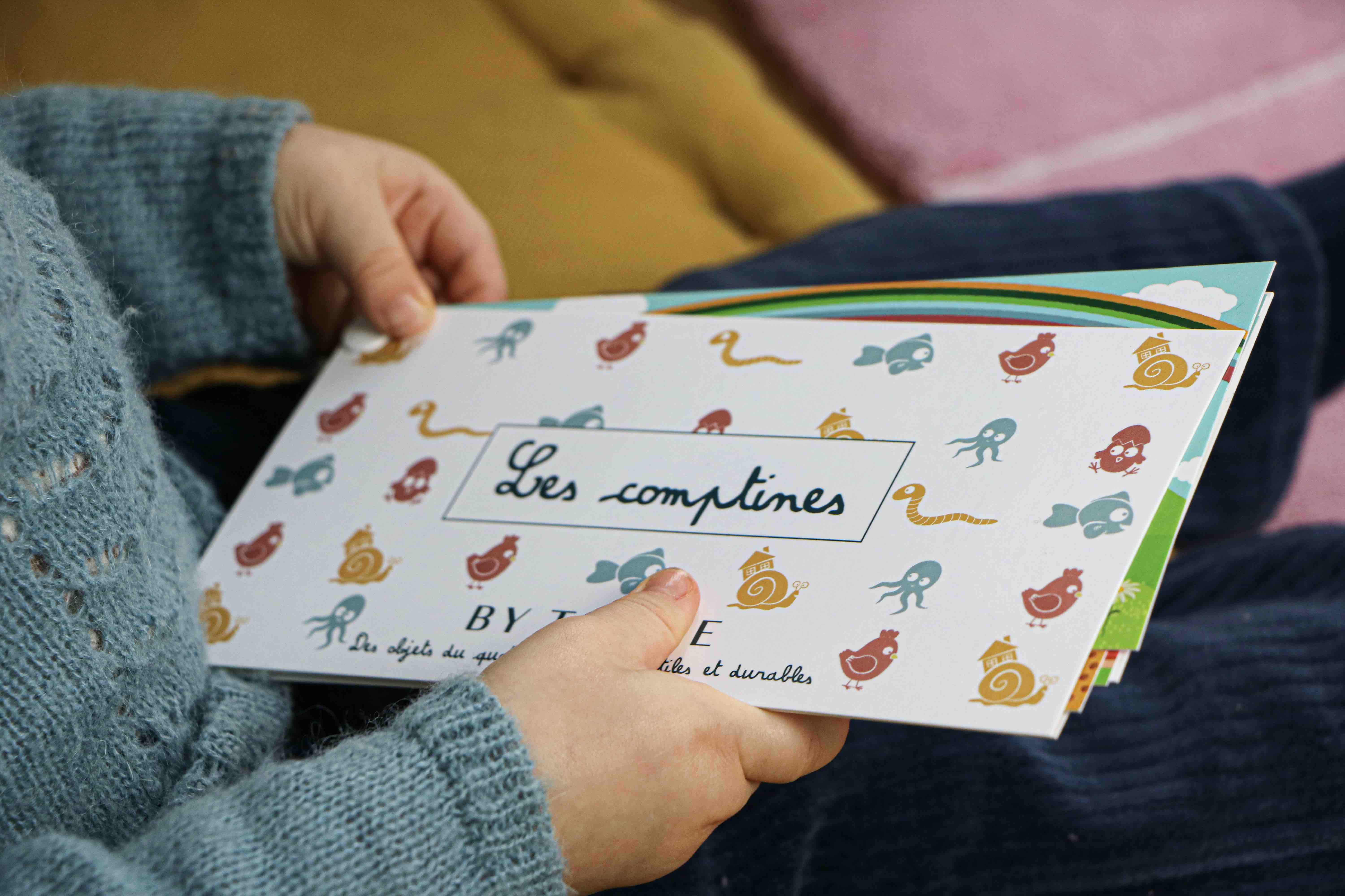 L’éventail des comptines et d’images est imprimé et relié à Rennes (Ile-et-Vilaine). L’imprimeur sélectionné par By Tiline a ouvert son atelier il y a plus de 80 ans et fait partie du réseau Produit en Bretagne. Son travail est empreint d’une démarche écologique forte. Il s’engage ainsi en faveur de la transition écologique dans l’industrie de l’imprimerie : utilisation des encres végétales sur les presses, investissements dans une machinerie diminuant la consommation d’eau lors de l’impression, adhésion à Imprim’Vert pour la bonne gestion des déchets.