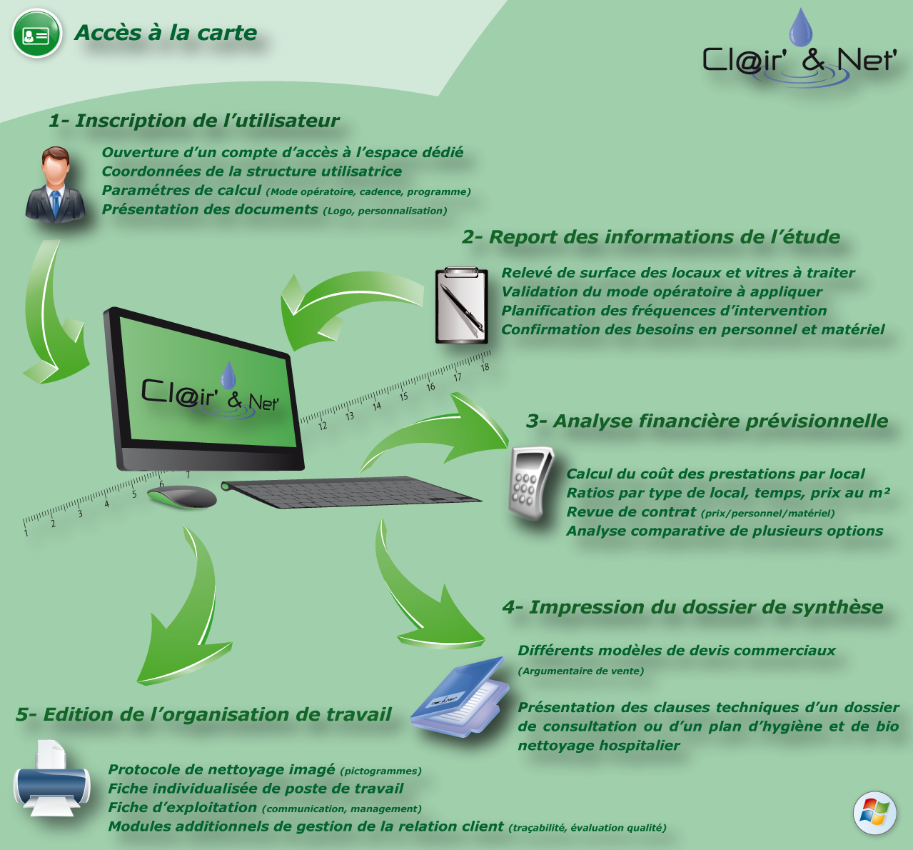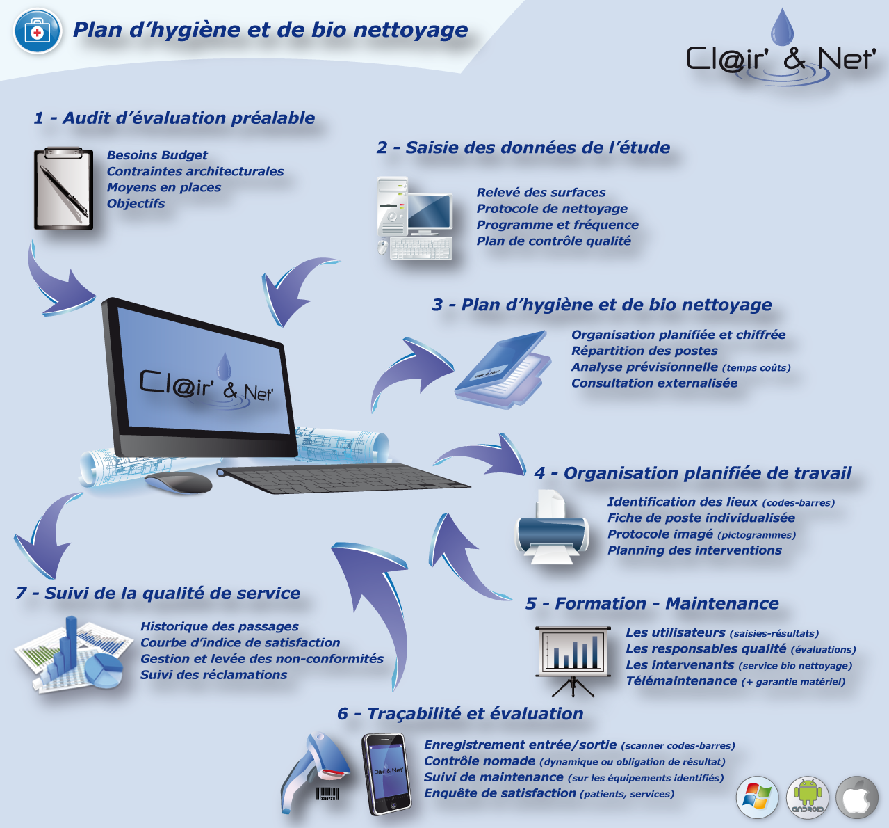 Clair’ & Net’ permet de chiffrer une étude de nettoyage, d’organiser la mise en place du travail, et d’assurer la traçabilité des interventions, en vue d’évaluer la qualité des prestations.
