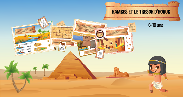 - La chasse au trésor “Ramsès et le trésor d’Horus” avec 13 énigmes à résoudre : des énigmes 6-10 ans, des énigmes spéciales 6/7 ans et 8-10 ans ;