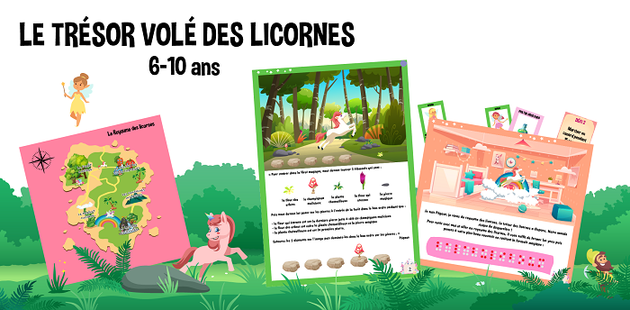 - La chasse au trésor “Le Trésor volé des Licornes” avec 13 énigmes à résoudre : 5 énigmes 6-10 ans + 8 énigmes 6/7 ans + 8 énigmes 8-10 ans ;