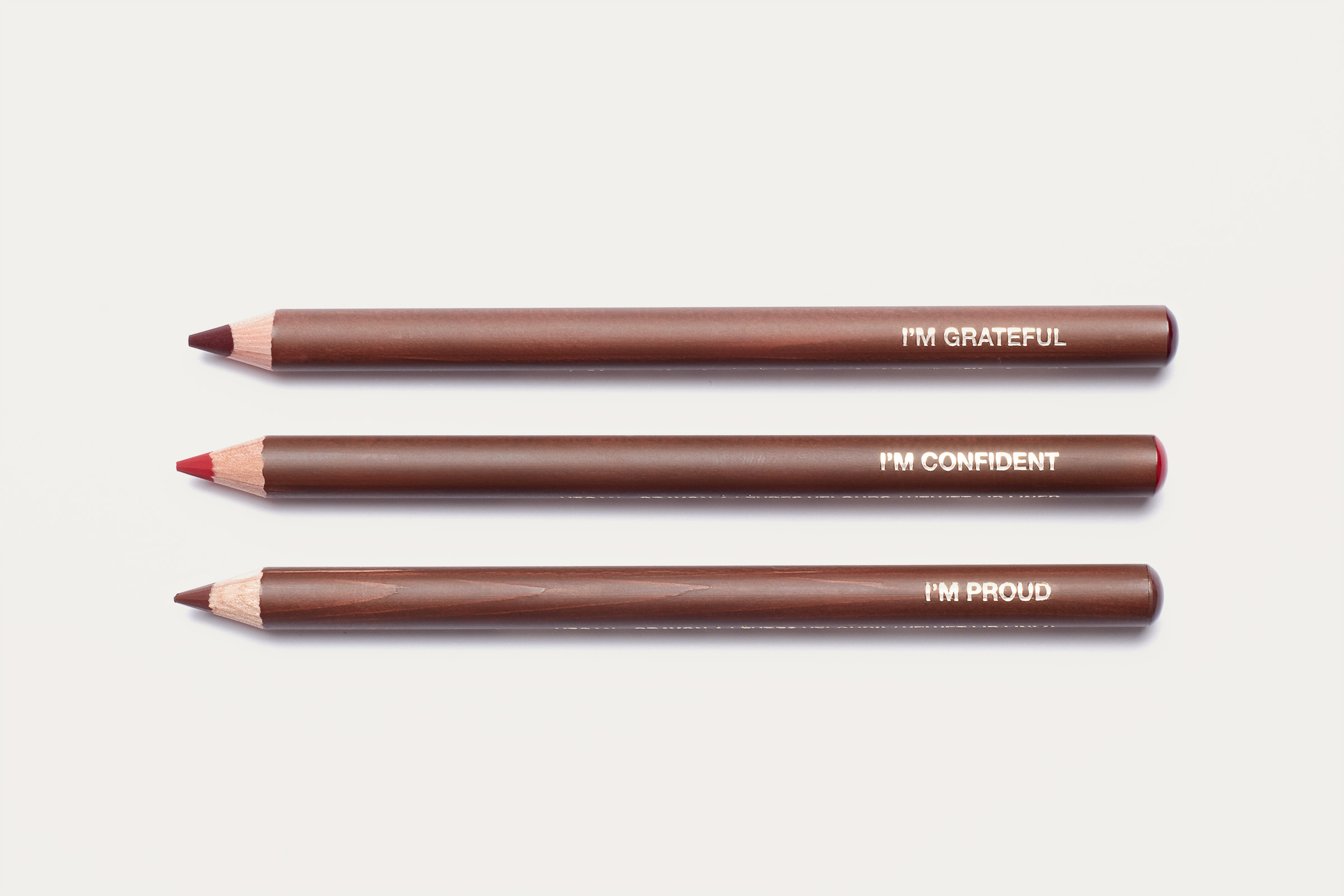 I’m grateful, I’m joyful, I’m positive, I’m confident et I’m proud sont cinq rouges à lèvres aux teintes chaudes, vives et éclatantes, portant le nom d’affirmations positives. Ces mantras quotidiens véhiculent des messages forts et représentent les états d’esprit de Melayci.