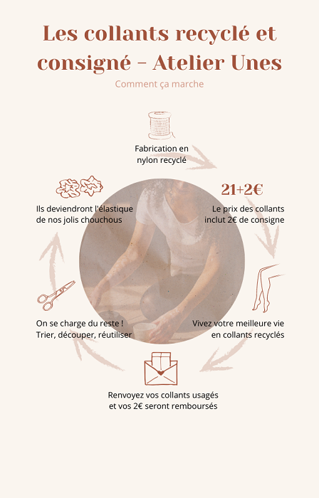 Preuve de son engagement, Atelier Unes a été la première marque à lancer une consigne sur ses collants recyclés :