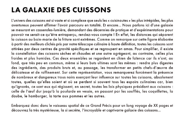 Le Grand Précis des cuissons… Ou comment tout comprendre sur le monde Ô combien brûlant et bouillonnant de la chaleur : bouillir, sauter, rôtir, braiser, gratiner, cuire à la vapeur et même mariner, parmi d’autres ! Entre humour potache et rigueur scientifique, voici enfin le titre expliquant aux consommateurs, aux curieux, aux chefs, aux pas chefs, aux étudiants, aux pas étudiants, aux initiés comme aux profanes, aux cordons-bleus, aux gâte-sauces et surtout à tous les curieux de nature, comment tirer le meilleur parti du feu, de la chaleur pour transformer les ingrédients et les révéler en recettes et plats merveilleux.