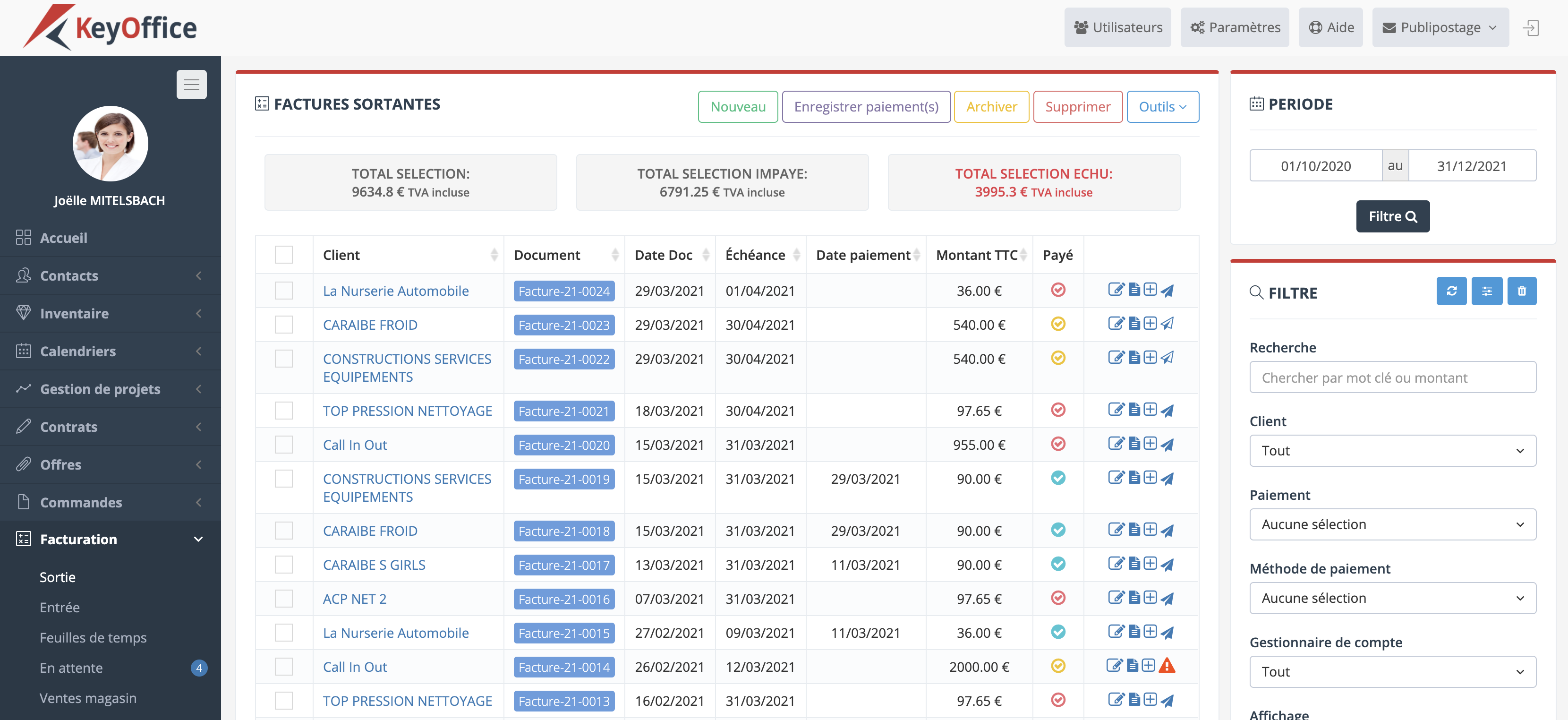 - Facturation : KeyOffice permet de créer et d’envoyer des factures personnalisées, avec un suivi des paiements et des rappels. Il permet la gestion des facturations récurrentes, les pro-forma, les acomptes…