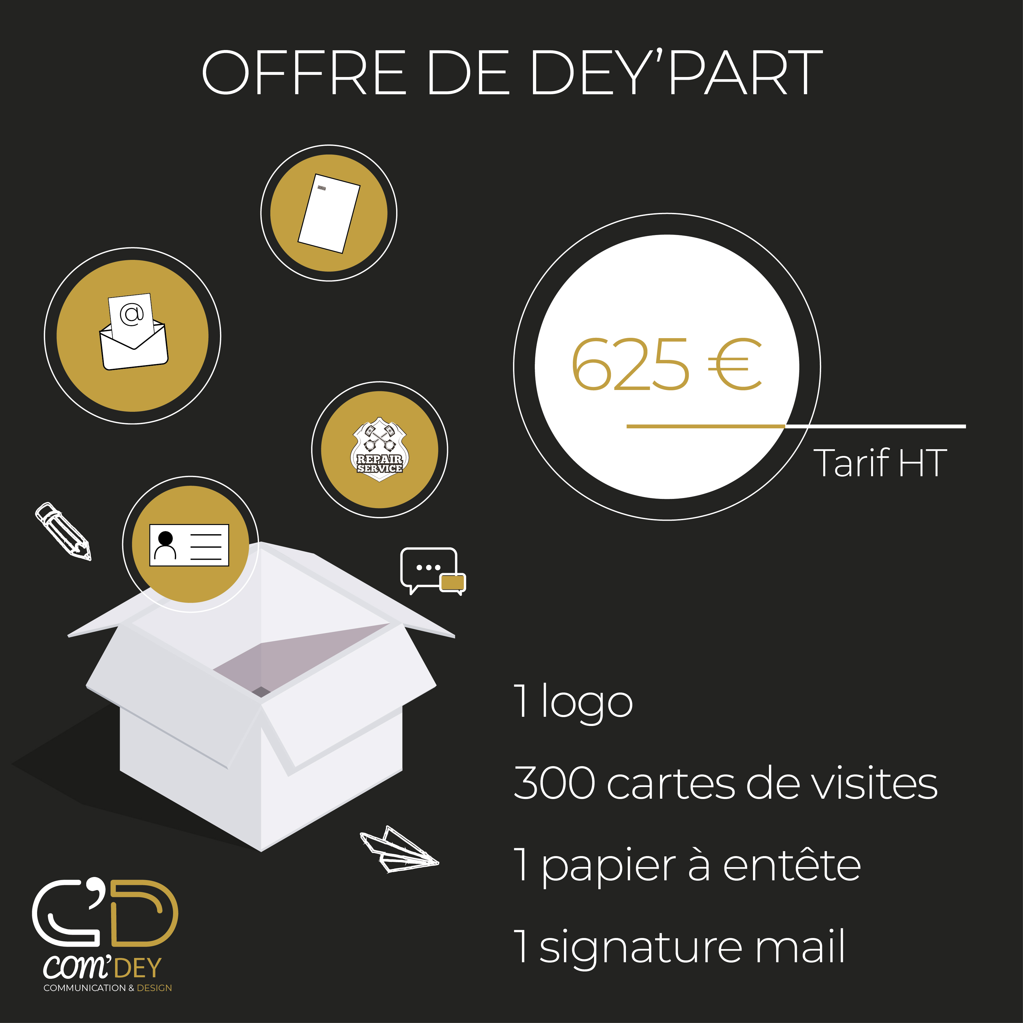 - Le pack « Dey’part » comprend un logo, 300 cartes de visite, 1 papier entête et une signature mail.
