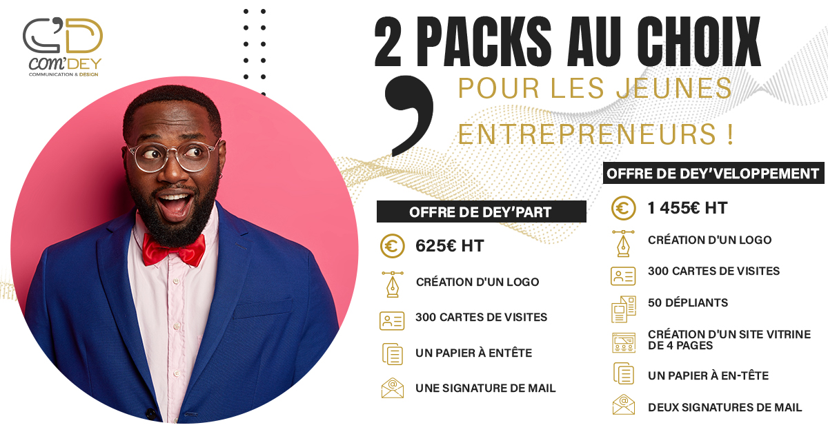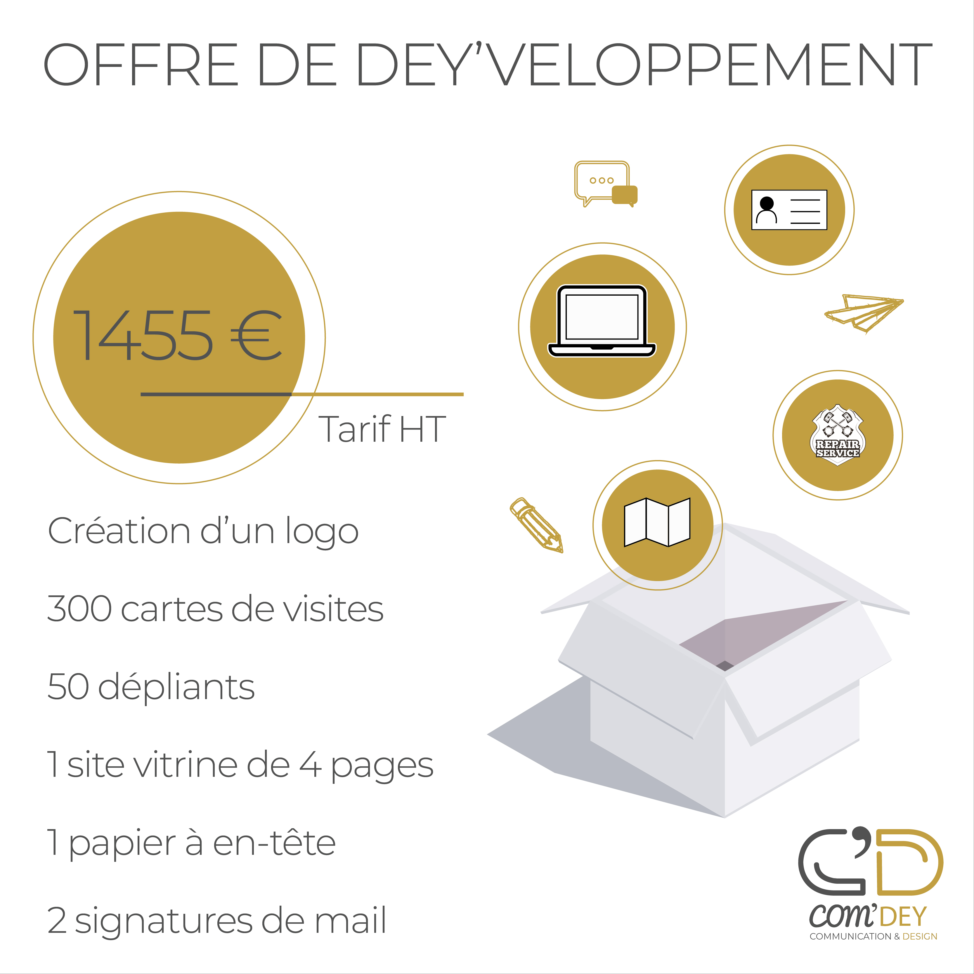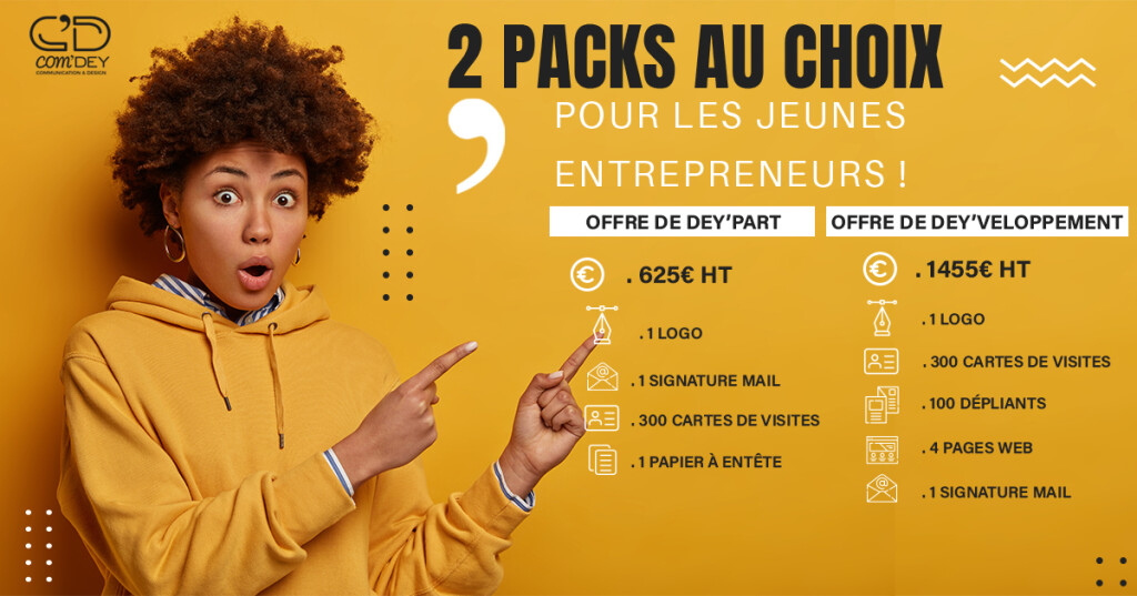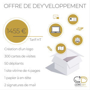 - Le pack « Dey’veloppement » est composé quant à lui d’un logo, de 300 cartes de visite, de 100 dépliants et de 4 pages web. Ces packs permettent aux entreprises de se doter d’une identité visuelle forte, à la fois sur le print et sur le web.