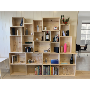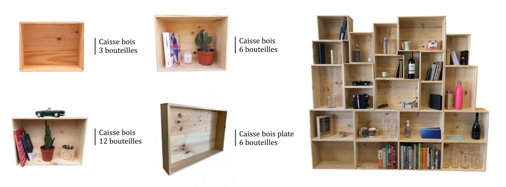 Par un jeu de superposition, de juxtaposition et d’assemblage, il est possible de réaliser un meuble en bois naturel et original avec ces caisses à vin. Solides, elles permettent, une fois assemblées d’obtenir un joli meuble d’appoint ou de rangement, des étagères ou même une grande bibliothèque.