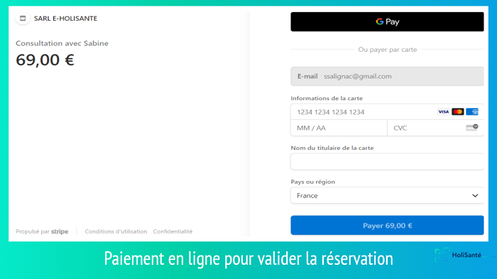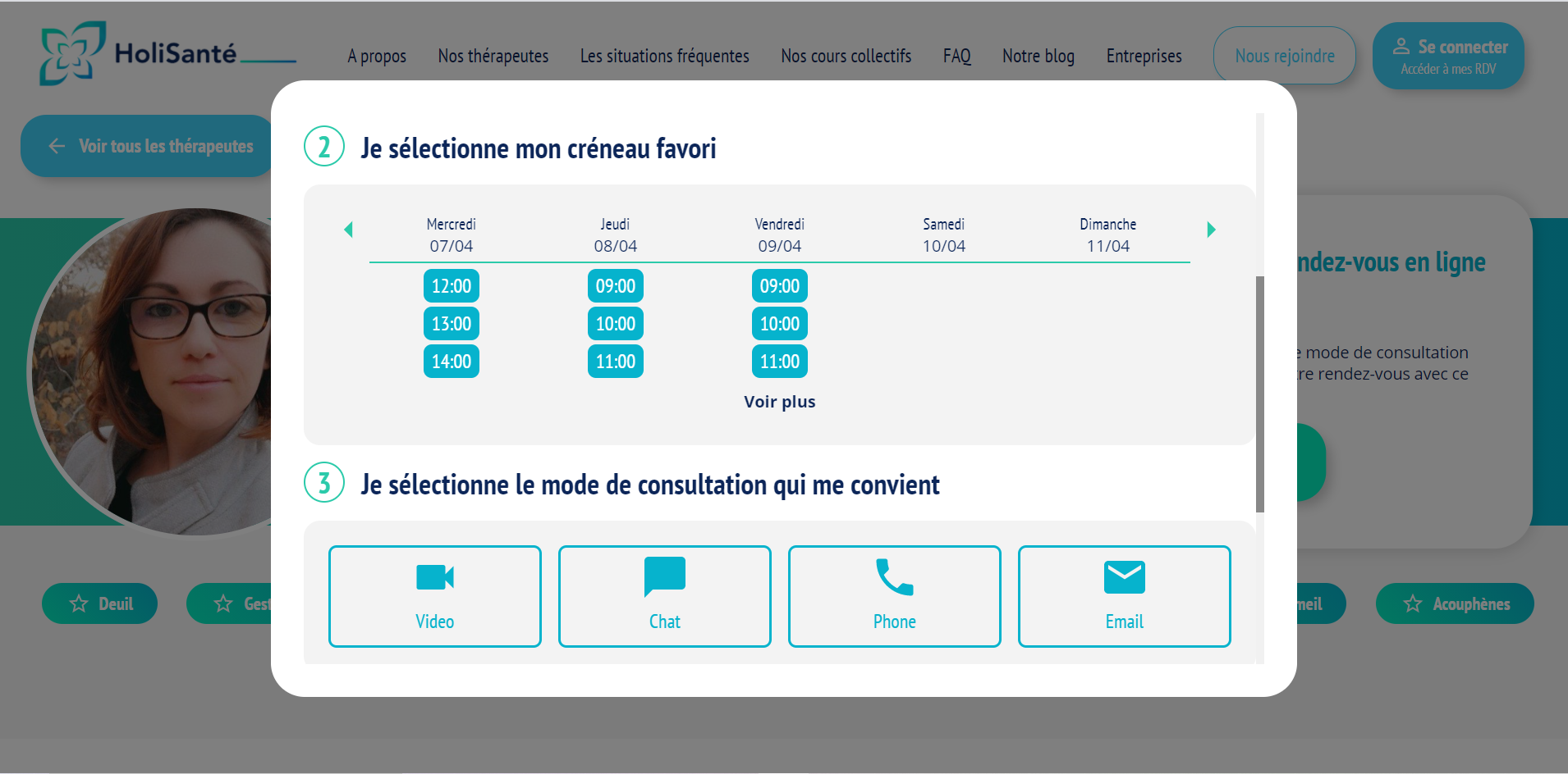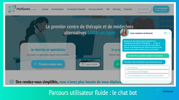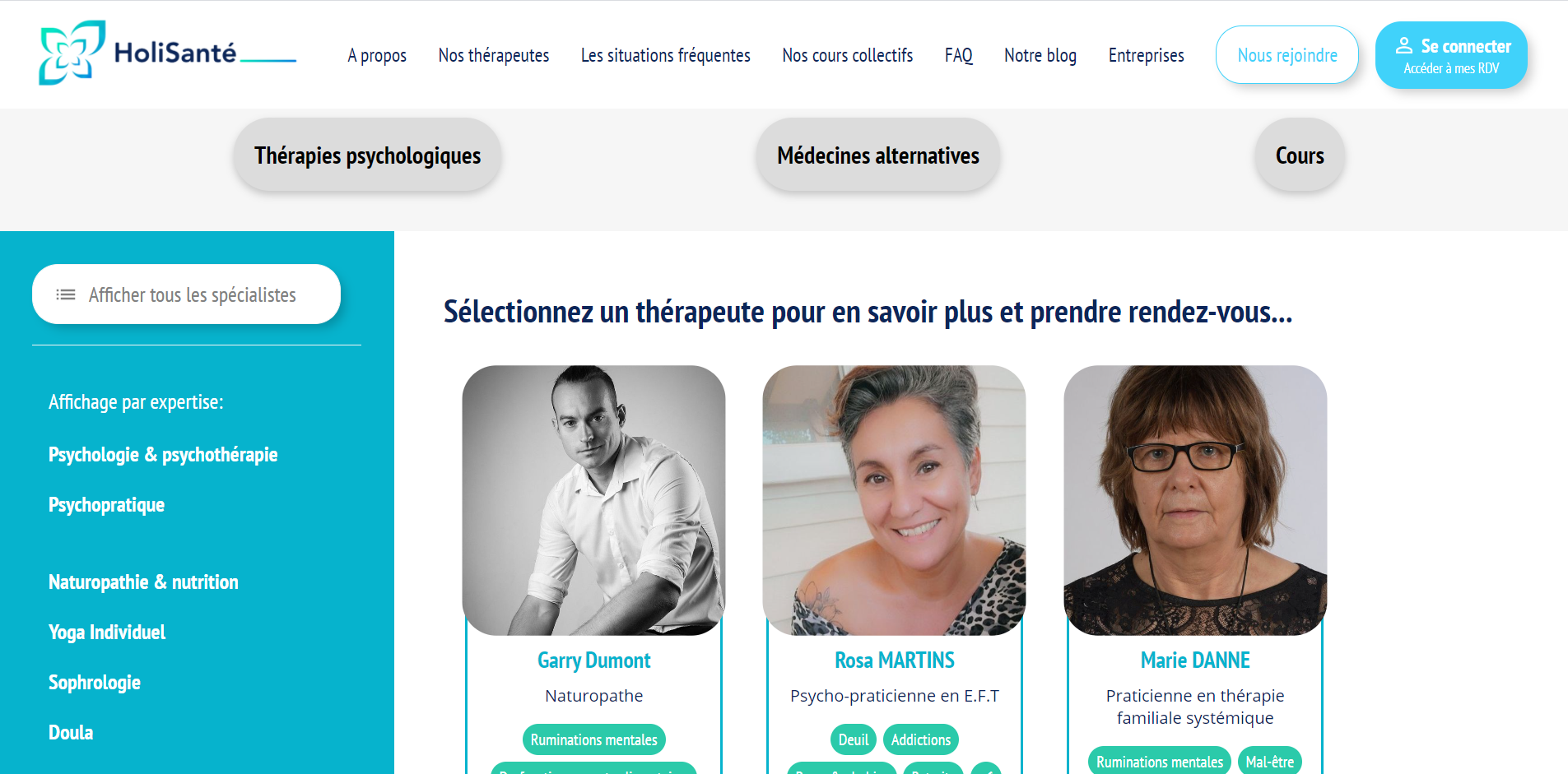 HoliSanté est une plateforme 100% en ligne de thérapies psychologiques et de médecines alternatives. Il est ainsi très simple, en quelques clics, de prendre rendez-vous pour une consultation qui se déroulera en visio-conférence, par téléphone ou par chat.