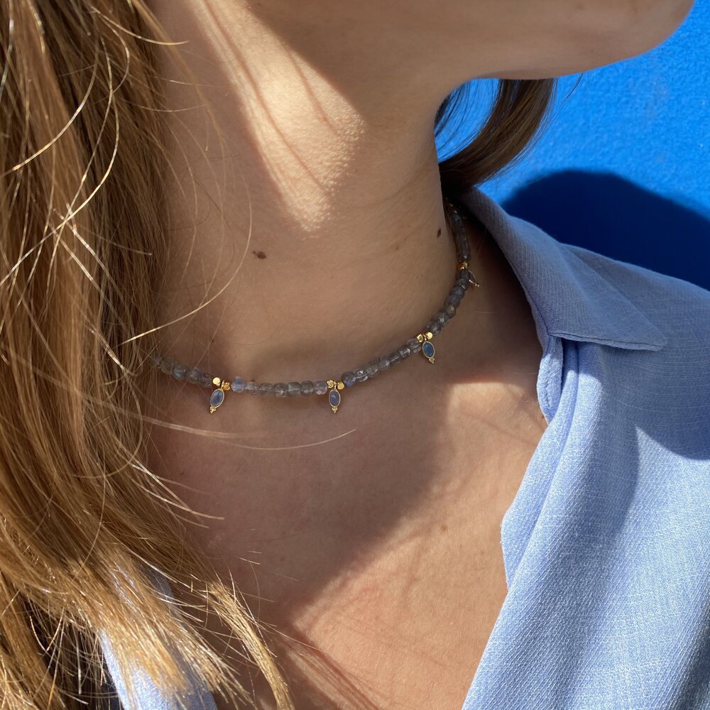 Collier Kurma, labradorite et petits talismans en sillimanite teintés bleu.