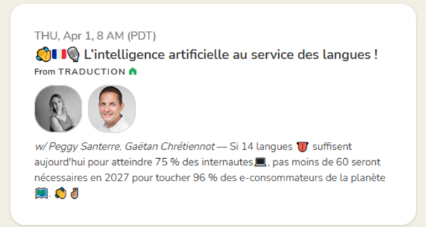 Vous voulez suivre les actus, les nouveautés, les tendances, les technos… IA/Traduction/Langues, suivez Gaëtan et Peggy lors des rooms c•l•u•b••h•o•u•s•e . qu’ils animent deux fois par mois.