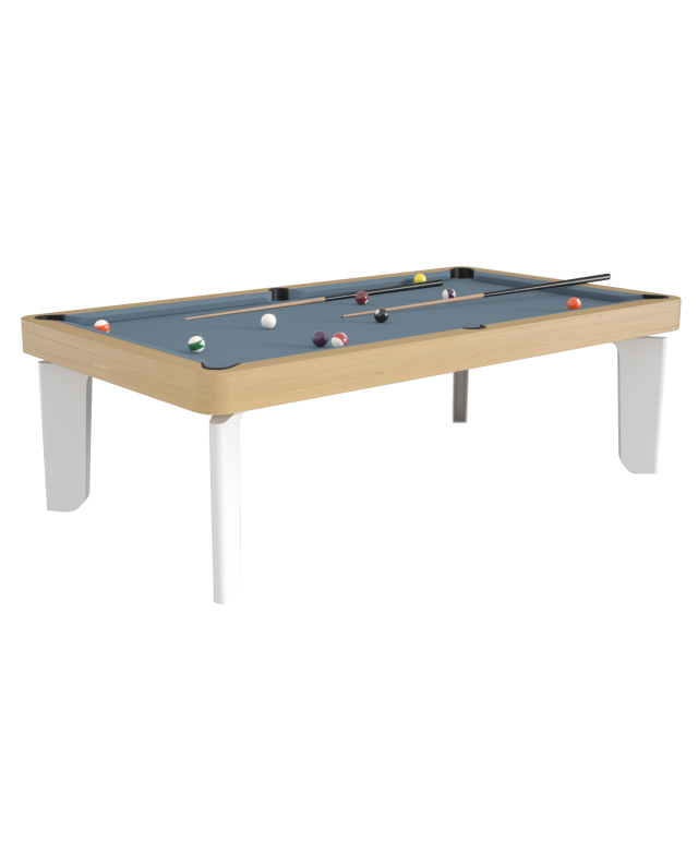Ce billard au style aérien et épuré est entièrement personnalisable. Il est disponible en version scandinave, avec un cadre massif en chêne naturel, en version ultramoderne, avec cadre et table laqués blanc mat et drap bleu poudre, ou en version classique, avec un cadre en noyer et un drap bordeaux.