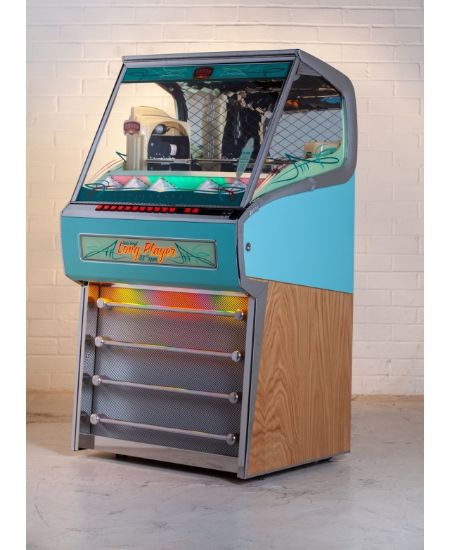 Également sorti des ateliers de Sound Leisure, le jukebox Long Player 33 Tours prend la forme d’un meuble rétro style années 50. Il est capable de lire 10 vinyles 33 tours, faces A et B, et est doté de la technologie bluetooth, qui permet d’écouter de la musique depuis un téléphone. Chaque jukebox est réalisé à la commande, et une large gamme de finitions est disponible.