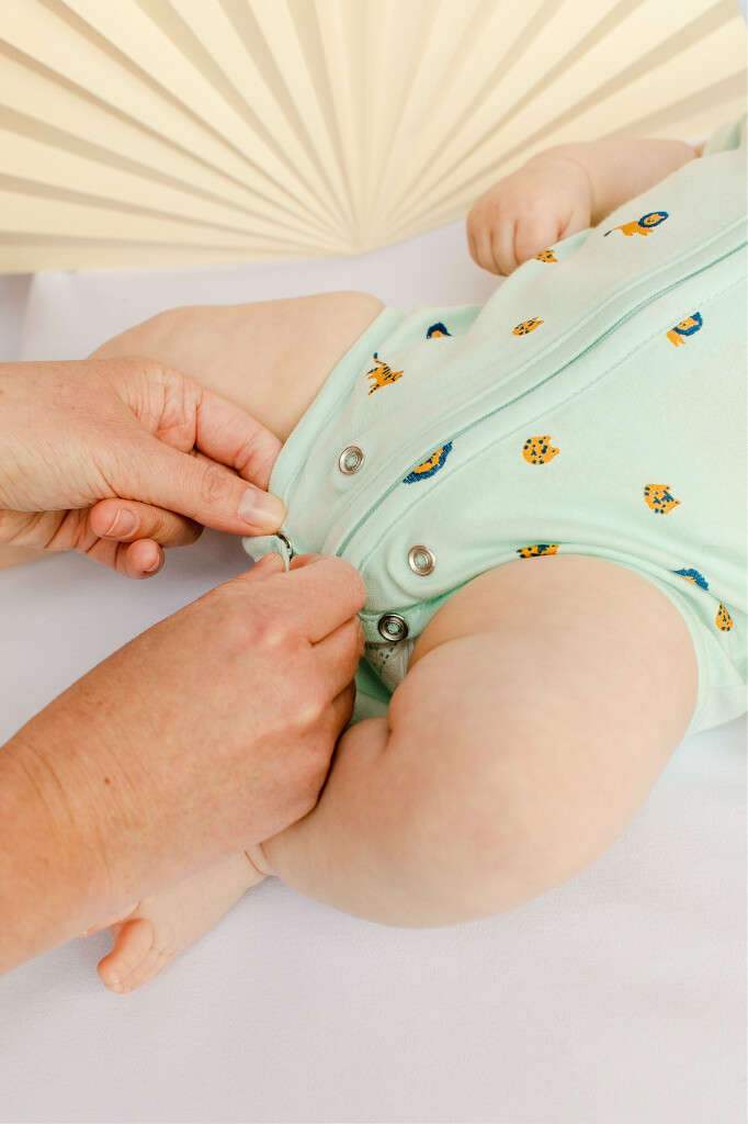 Ce système ingénieux permet d’habiller et de déshabiller bébé en un éclair, et offre un accès facile à la couche.