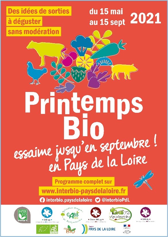 Le programme régional du Printemps Bio est proposé par INTERBIO Pays de la Loire en partenariat avec ses adhérents : les GAB, groupements de producteurs bio et le CIVAM Bio Mayenne, les producteurs, les magasins bio, les entreprises des Pays de la Loire. D’autres partenaires tels qu’Angers Loire Métropole, la LPO et d’autres associations nous ont rejoints dans l’organisation de ce temps fort.