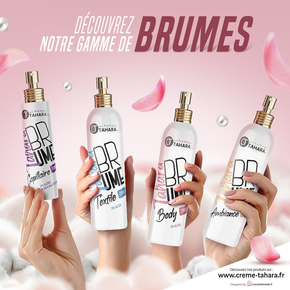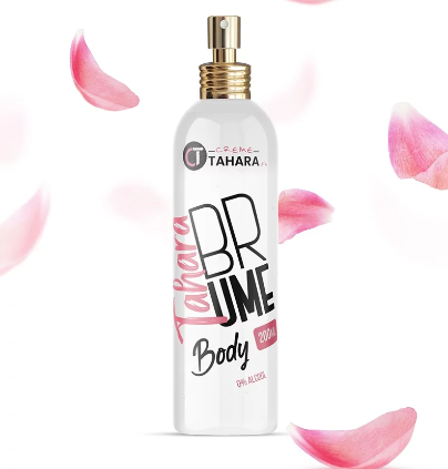 - Brume corporelle 200ml sans alcool. Cette nouvelle brume est parfumée à la douce odeur de Tahara. Cette odeur orientale est un mélange frais, de « propre » de musc blanc et de peau de pêche et de rose, un mélange qui réveille l’odorat. Plus parfumée que les brumes en général, celle-ci est conçue pour le corps et rivalise en rémanence avec les parfums classiques.