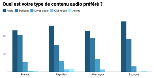- La radio reste le média le plus écouté et le podcast perce. En France, 41% préfèrent le podcast, à peine 5% de moins que la radio.